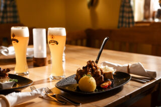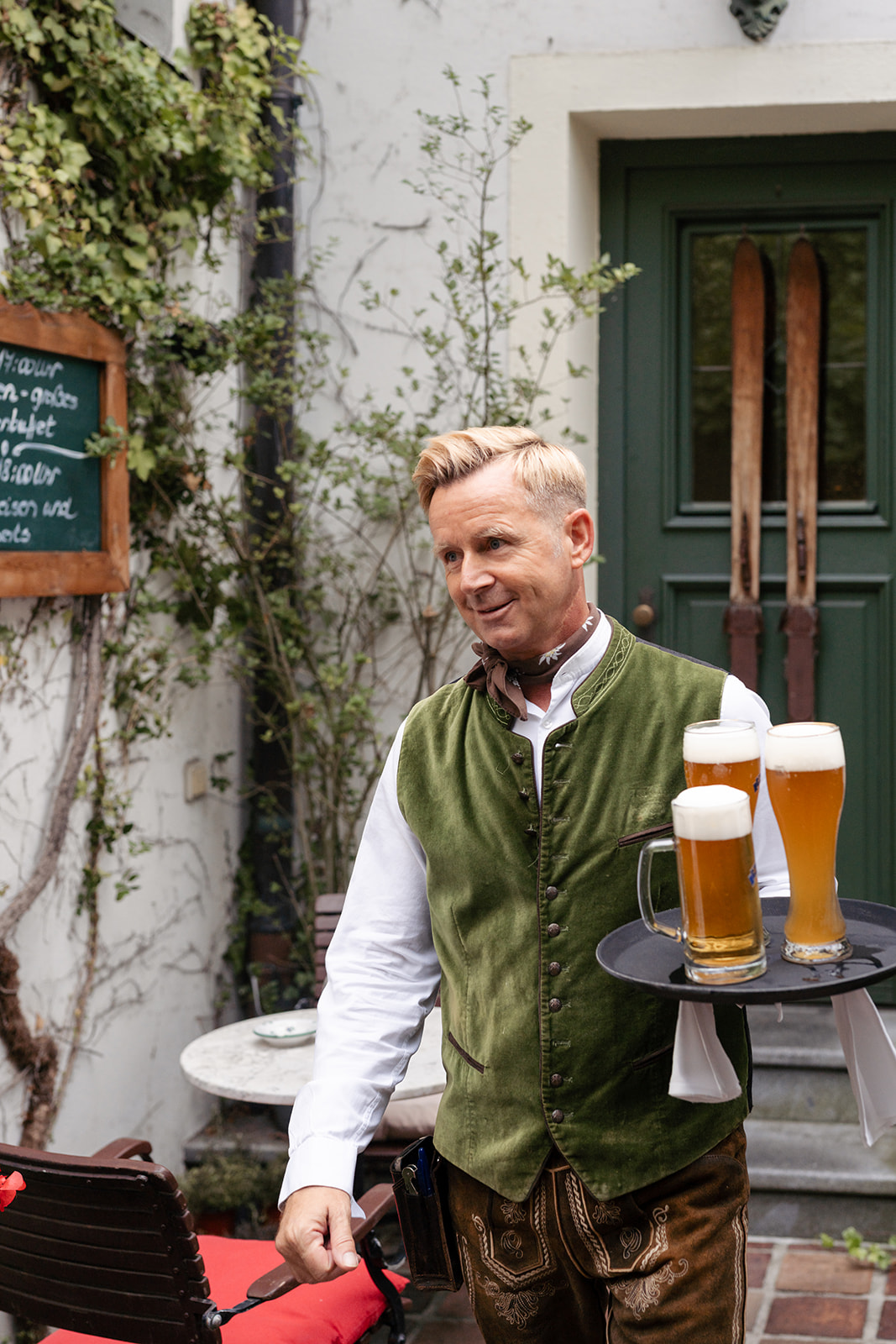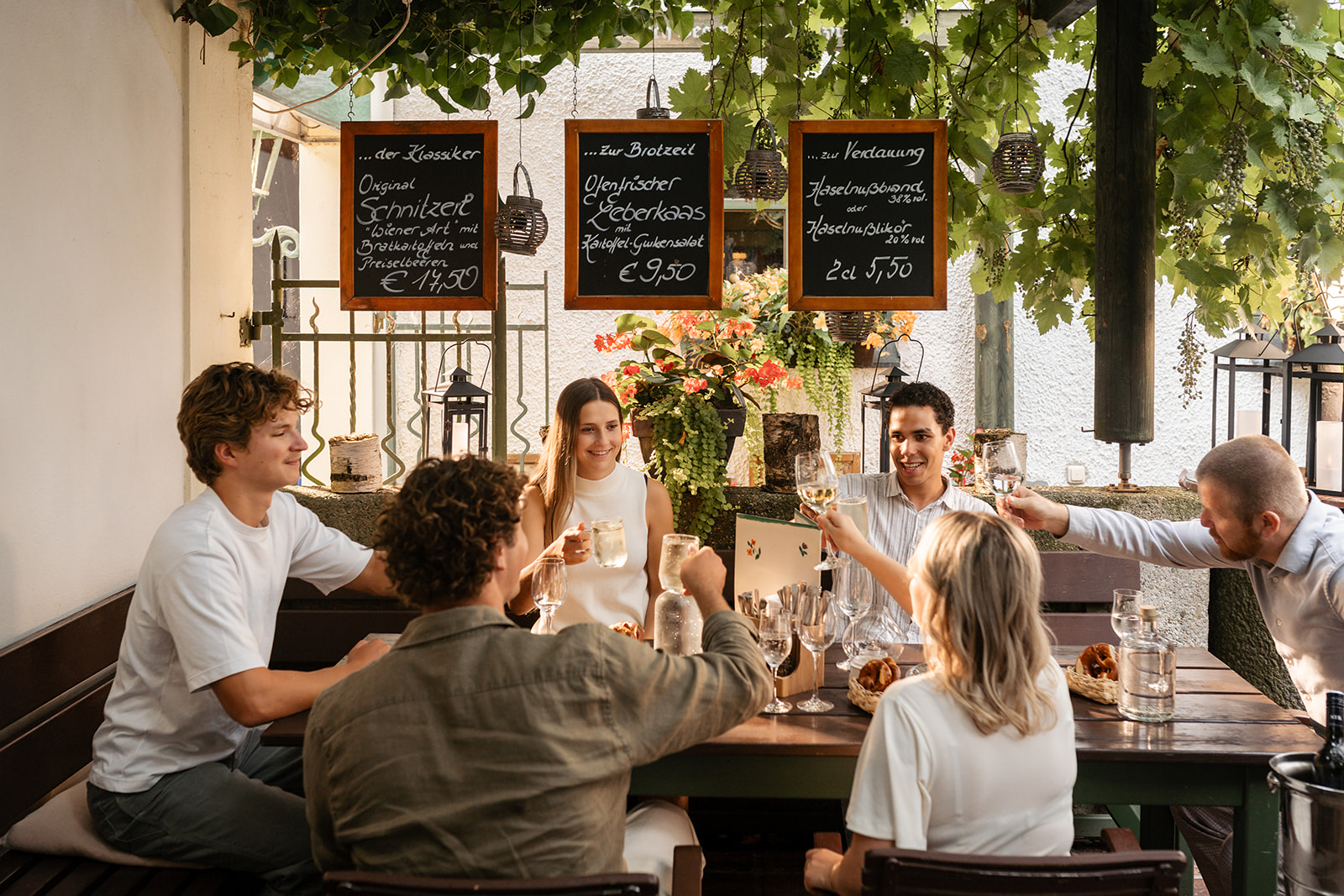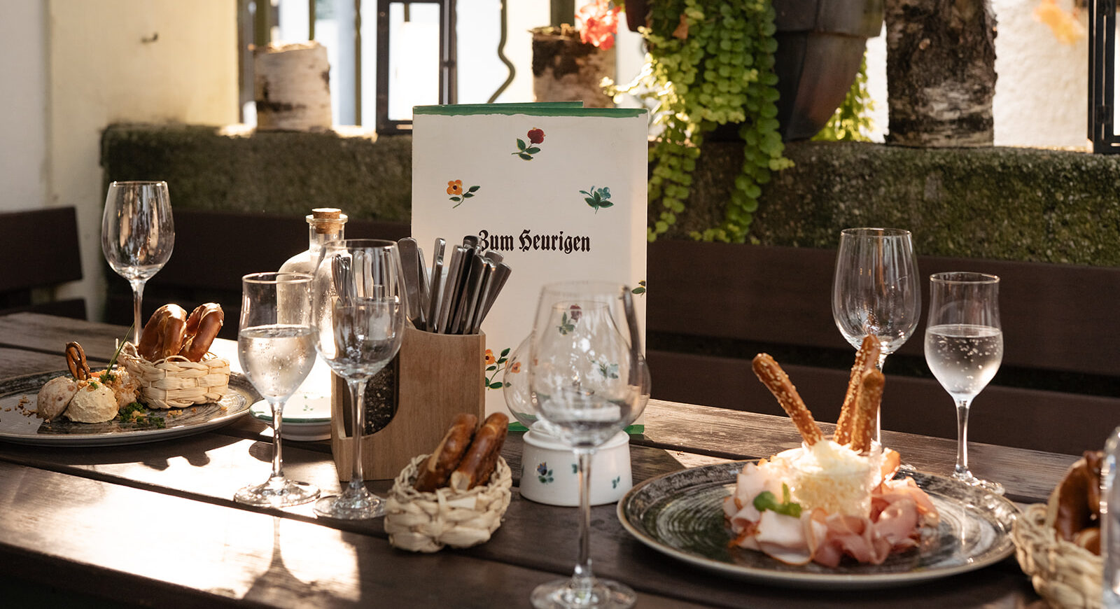 Unter der Holzdecke, an antiken Tischen und Bänken, spürt man den Geist von Grinzing. Dekorative Details wie die Gmundner Keramik mit floralen Mustern bringen zusätzliche Wärme und Charme. Jeden Donnerstag erfüllen Zithermusik und Akkordeonklänge den Raum, und im Sommer lädt der grüne Weinhof zu echter Heurigen-Romantik unter dem Sternenhimmel ein.